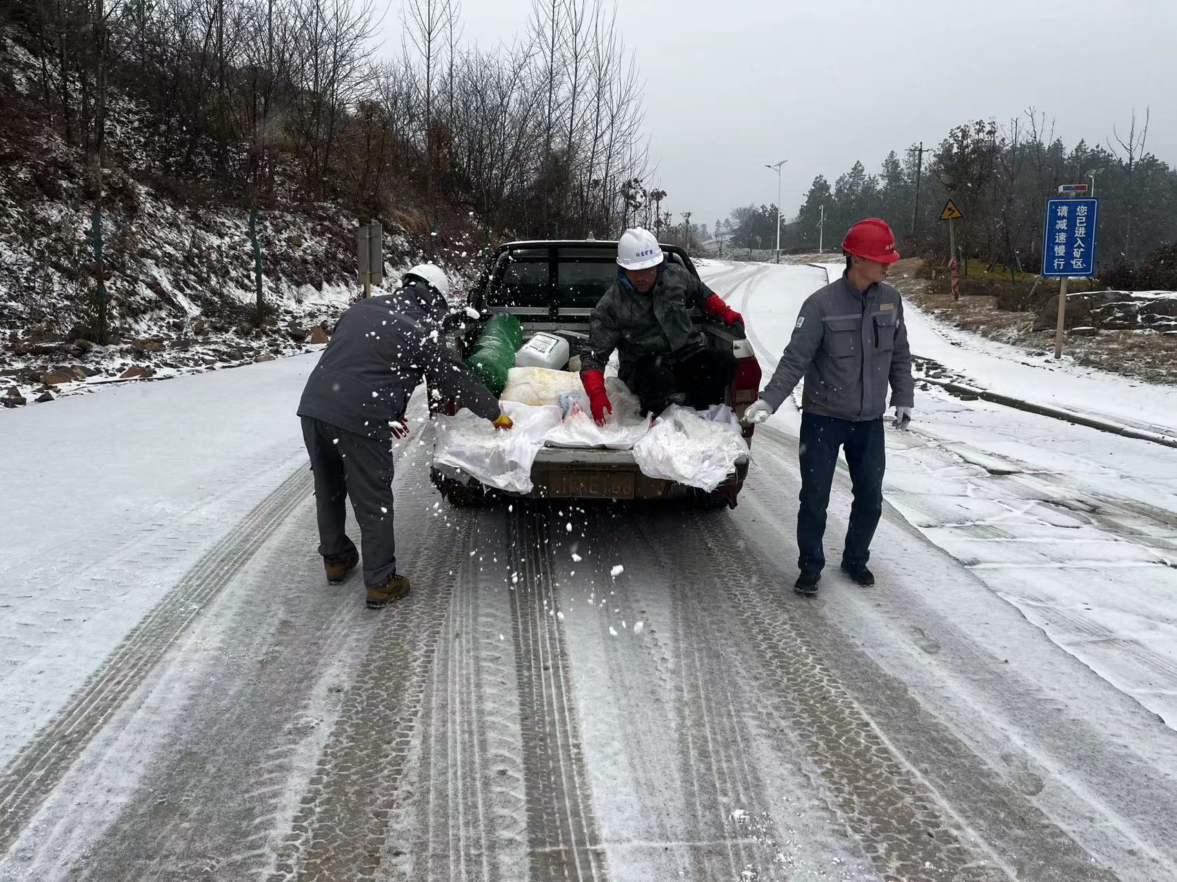 根據(jù)實(shí)時(shí)天氣變化和道路狀況,興全礦業(yè)提前做好詳細(xì)的融雪防滑預(yù)案和應(yīng)急物資準(zhǔn)備,第一時(shí)間安排人員至運(yùn)輸?shù)缆窉伻鋈谘﹦M織人工鏟雪,防止道路結(jié)冰,保障運(yùn)輸安全。